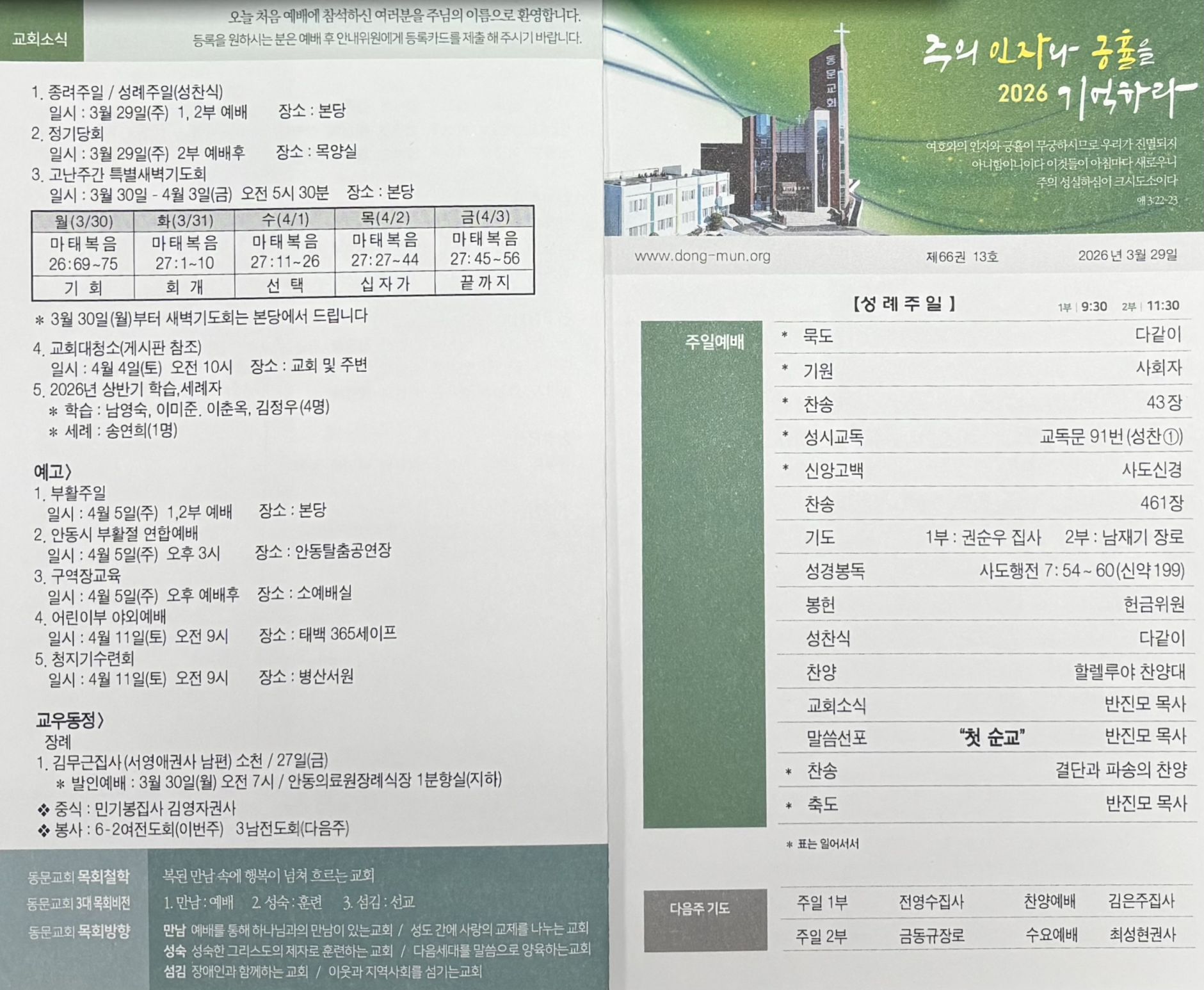 - 일시 : 3월 29일(주) 1, 2부 예배 - 장소 : 본당